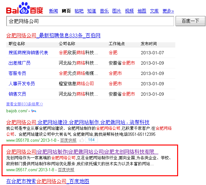 經過我公司技術人員的一致努力,目前,百度搜索“合肥網絡公司”一詞,我們的網站www.buybooks.com.cn 已躍至百度排名第二位。以下是2013年1月8日的百度搜索截圖: